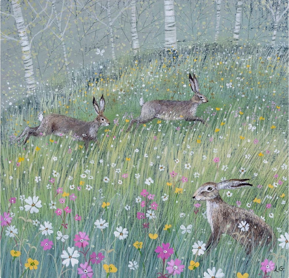 Lièvres, fleurs et bouleaux