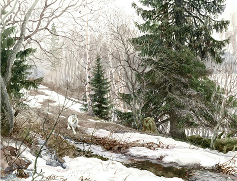 Lièvre variable en hiver sur un vieux chemin de Karélie