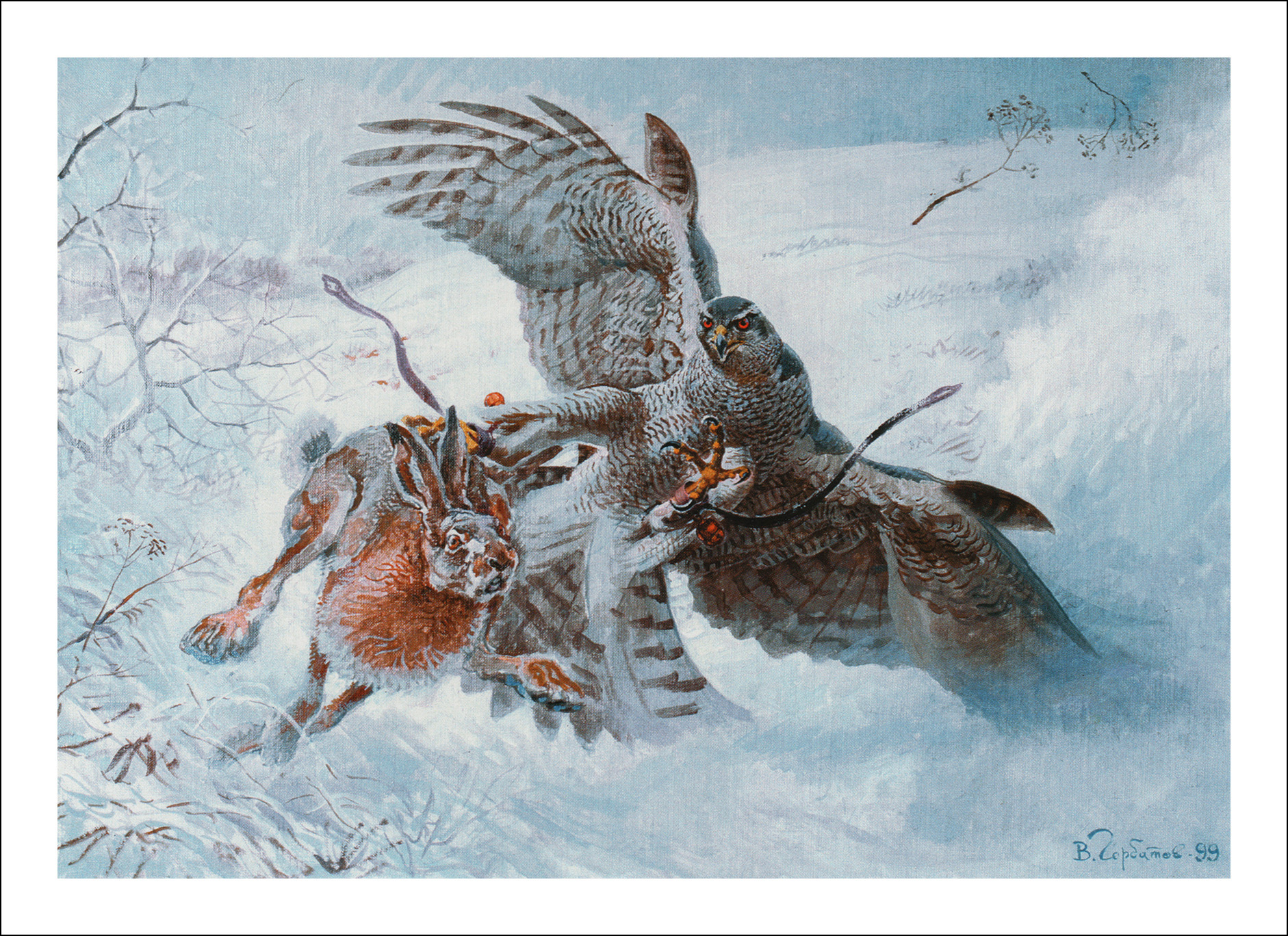 Chasse au lièvre avec un autour en hiver