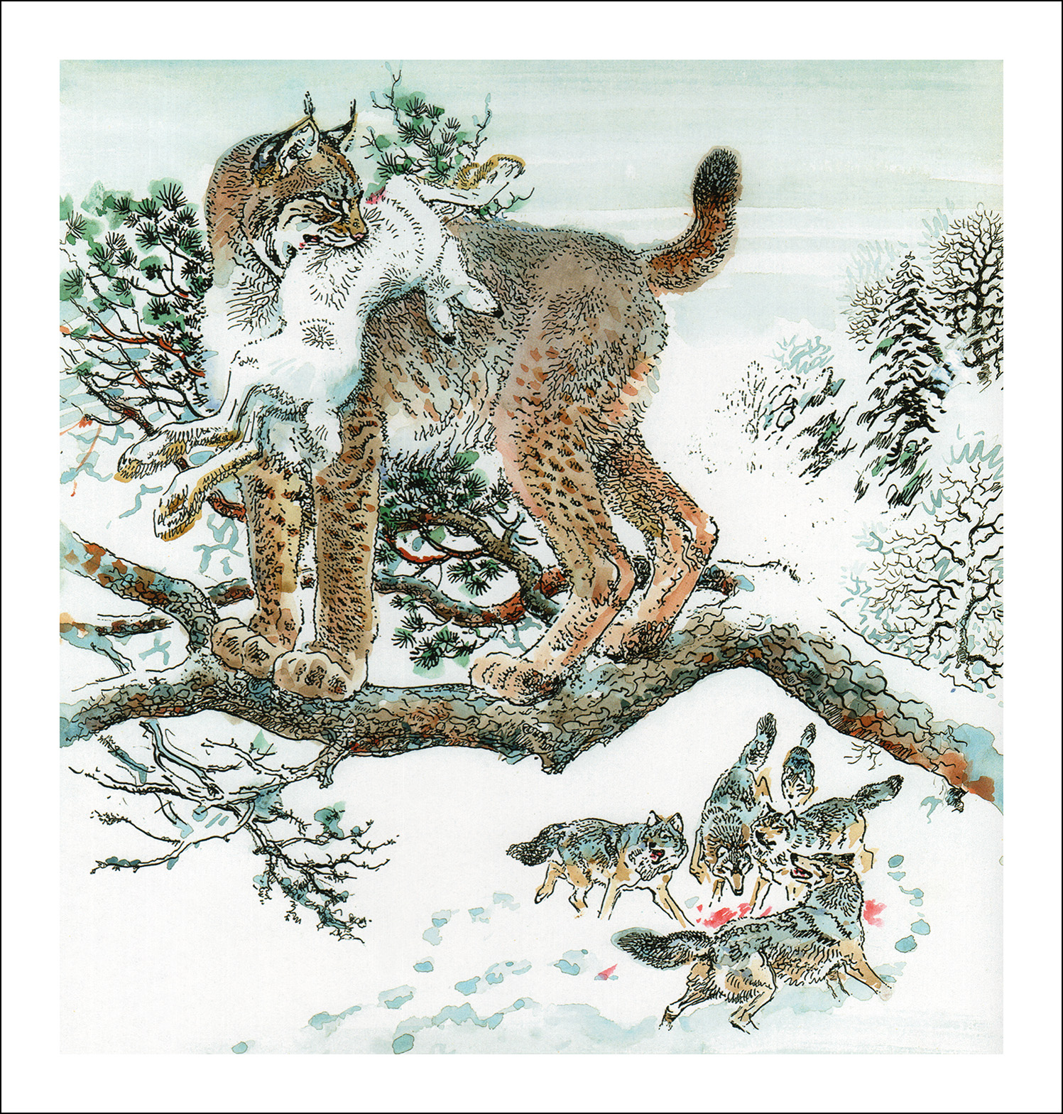 Lynx ayant capturé un lièvre variable, narguant les loups de son arbre