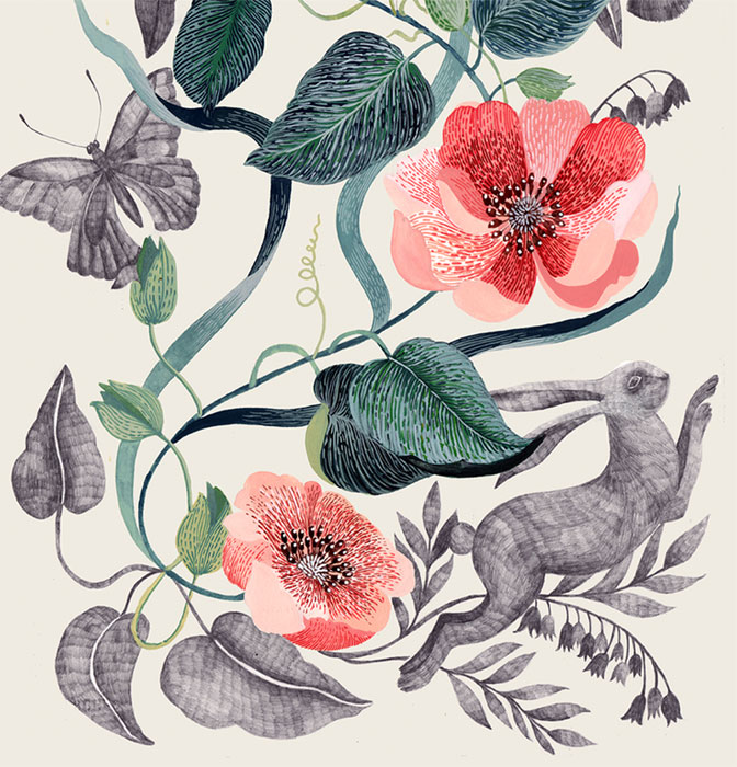 Lièvre, coquelicots, feuillage et papillon