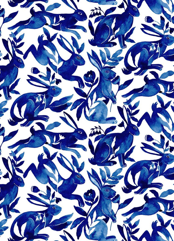 Lièvre, Fleurs et Feuilles , Dessin pour un papier peint