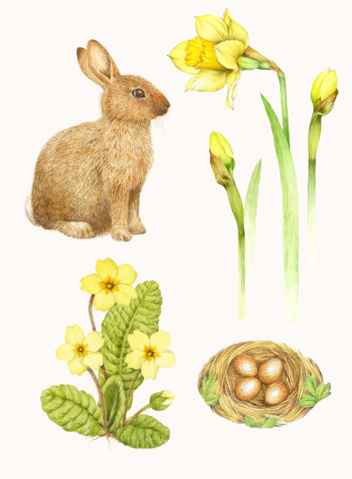 C'est le printemps : lapin de Pâques, œufs, jonquilles et primevères