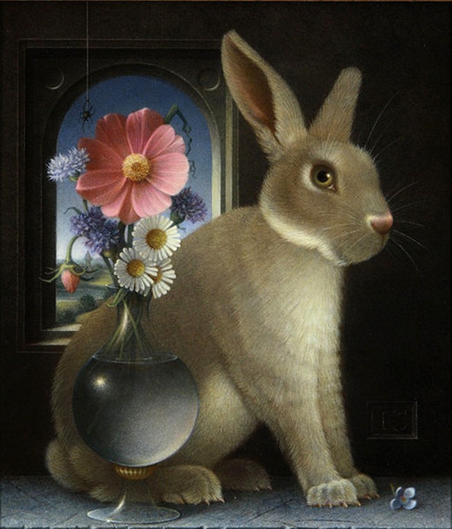 Lapin gris avec un bouquet de cosmos et pâquerettes