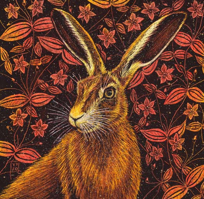 Lièvre et feuillage brun-rouge