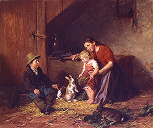 Les deux aînés apprennent à la plus jeune à nourrir les lapins