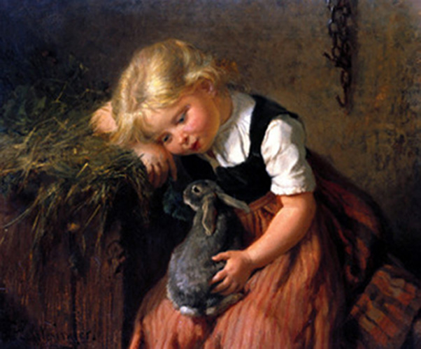 Fillette rêveuse, avec un lapin sur ses genoux.