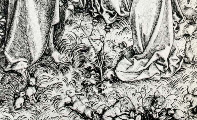 La tentation du Christ DÉTAILl : 3 fois 3 lapins batifolent au pied du Christ